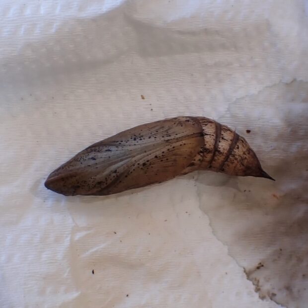 蛹。 土と葉っぱで作った部屋(蛹室)の中で蛹になる。