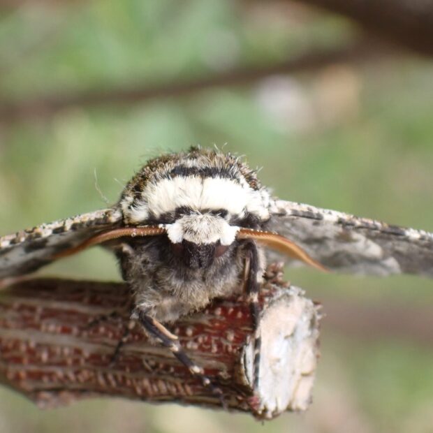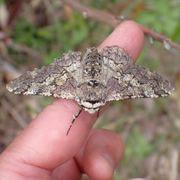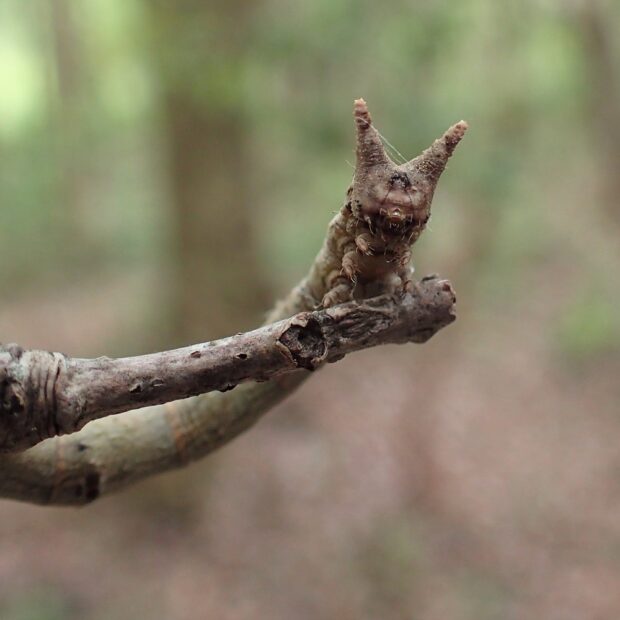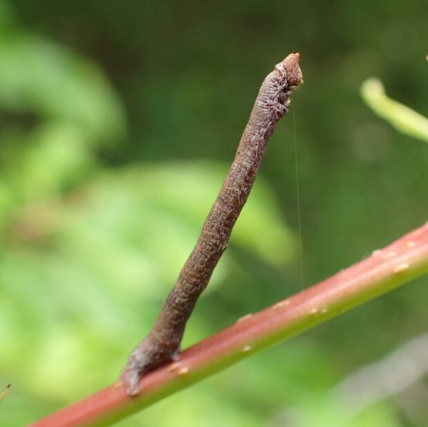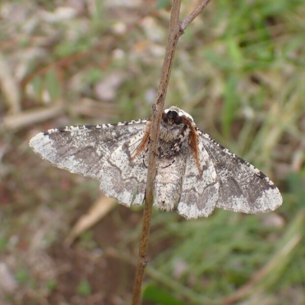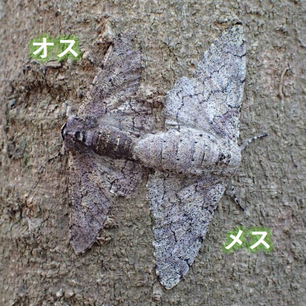 春にだけ見られるエダシャクの仲間。 やや紫がかった灰褐色で、 色や模様は変異があります。 幼虫は大きなシャクトリムシで、 頭のV字型の突起が、 ウサギの耳のように見えます。 雑木林や自然公園などで見られます。 蛹越冬。 (MT)