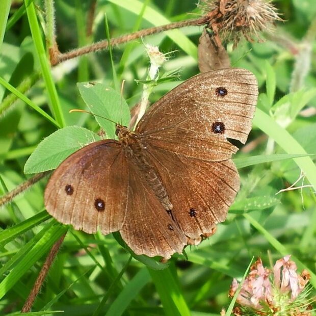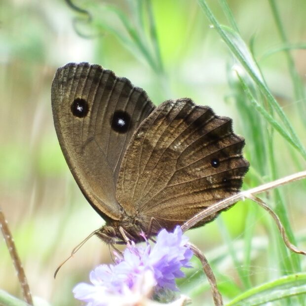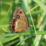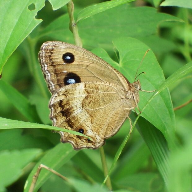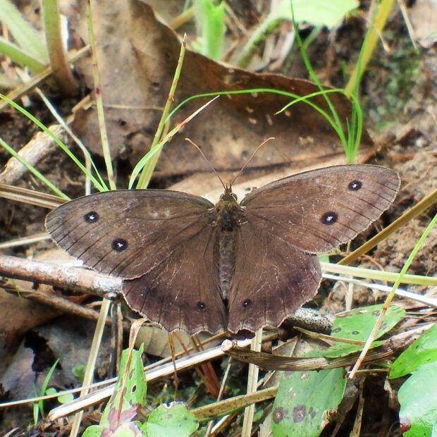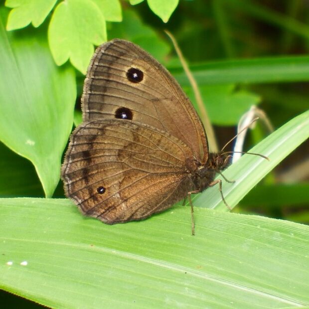 夏にあらわれる中型のタテハチョウ。 平地から山地の明るい草はらをゆっくり飛び、 葉によくとまります。 茶色のはねには丸い紋があり、 中はるり色で美しいです。 メスは、 食草に卵を産みつけず、 地面に生み落とします。 幼虫越冬。