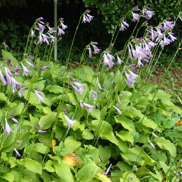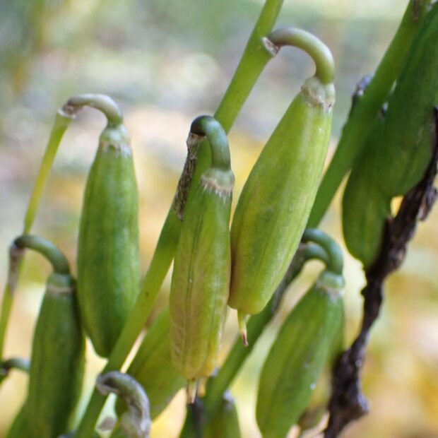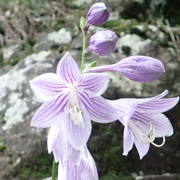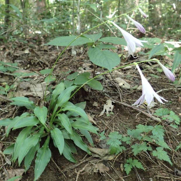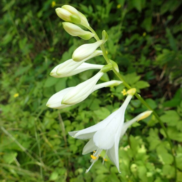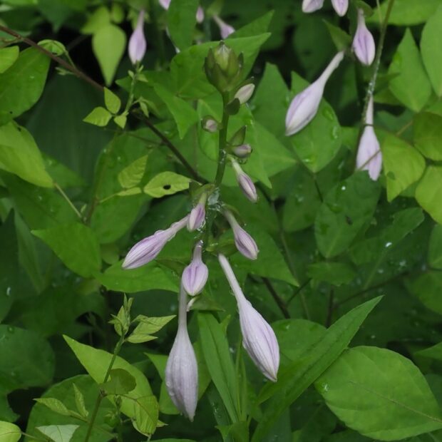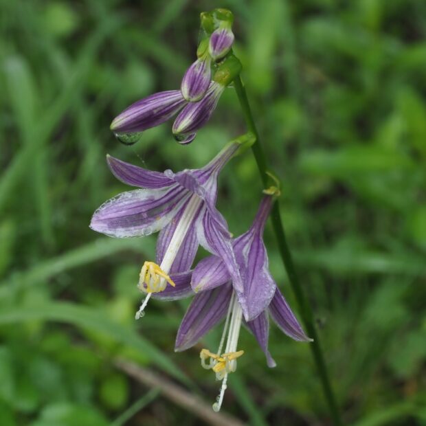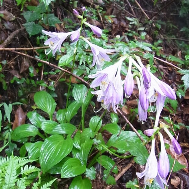 つぼみの形が橋の欄干につけられる擬宝珠(ギボシ)に似ていて、 オオバギボウシに対して葉が小さいことから小葉擬宝珠(コバギボウシ)となりました。