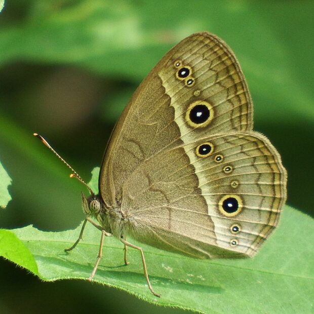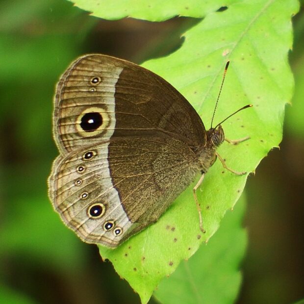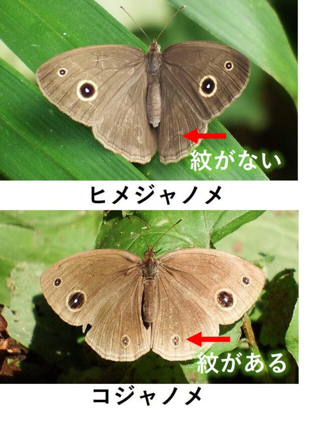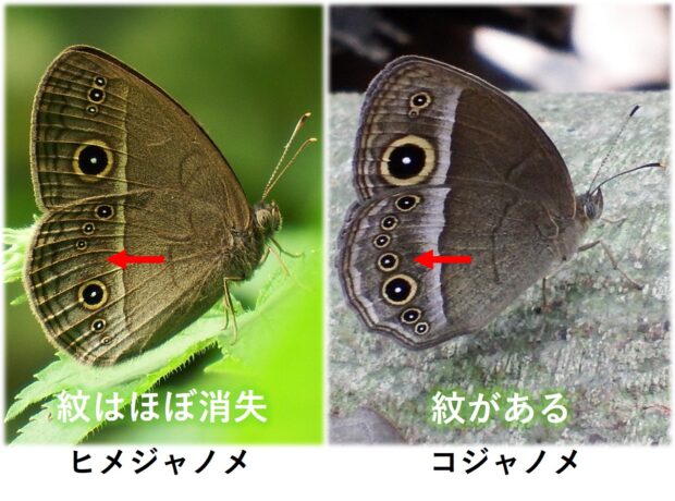 ヒメジャノメは、 はねの色は明るく、 明るい環境を好みます。 白い帯は黄色みをおびます。