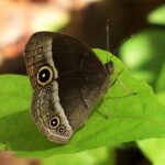 コジャノメは、 はねの色は暗く、 薄暗い環境を好みます。 白い帯は紫かがります。