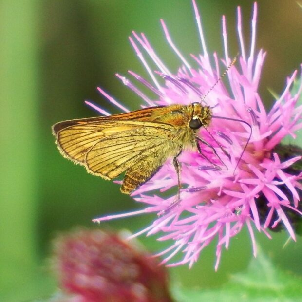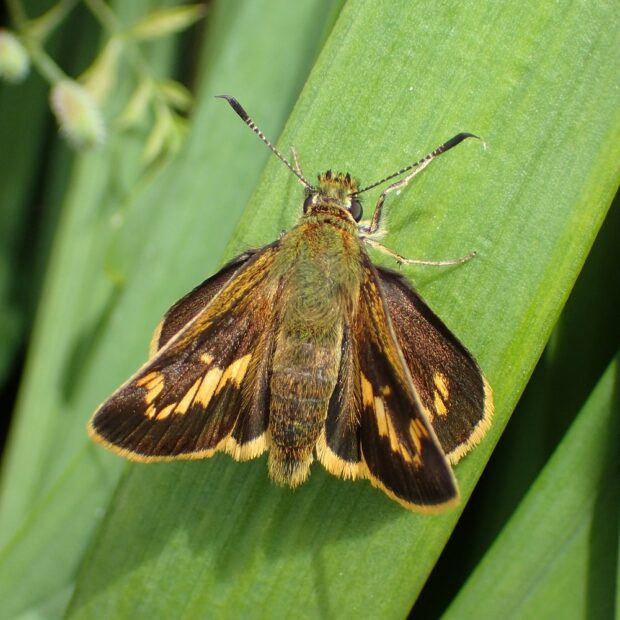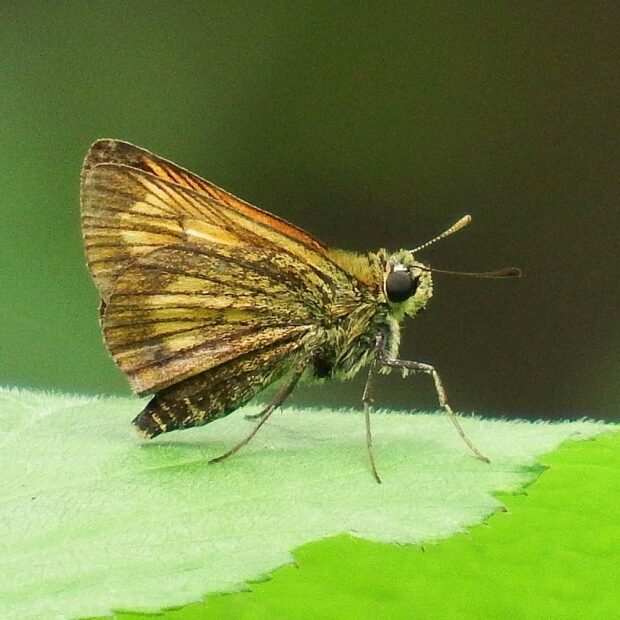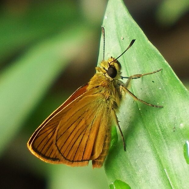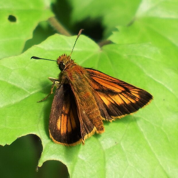 オレンジ色がかった黄色の小さなセセリチョウ。 里山や山地の林縁を敏速に飛び、 いろいろな花を訪れ、 地面で給水も行います。 春(5~6月)と夏(8~9月)、 年2回発生します。 幼虫越冬。