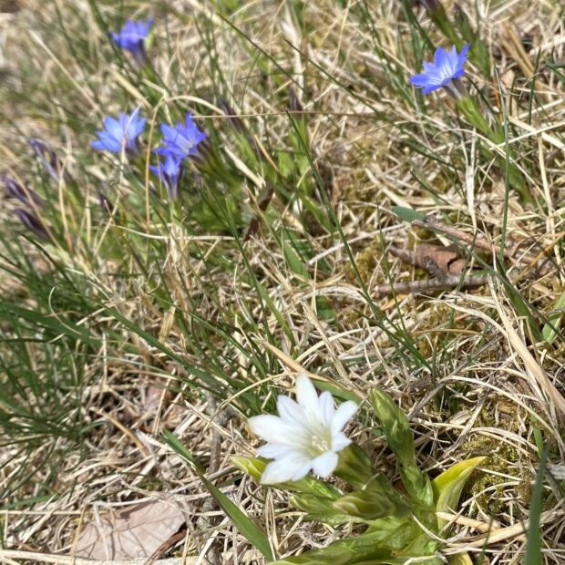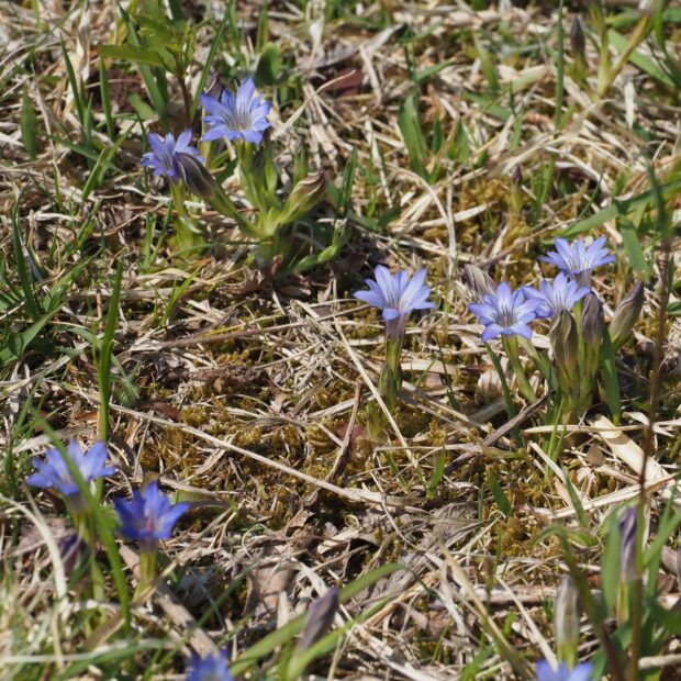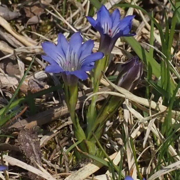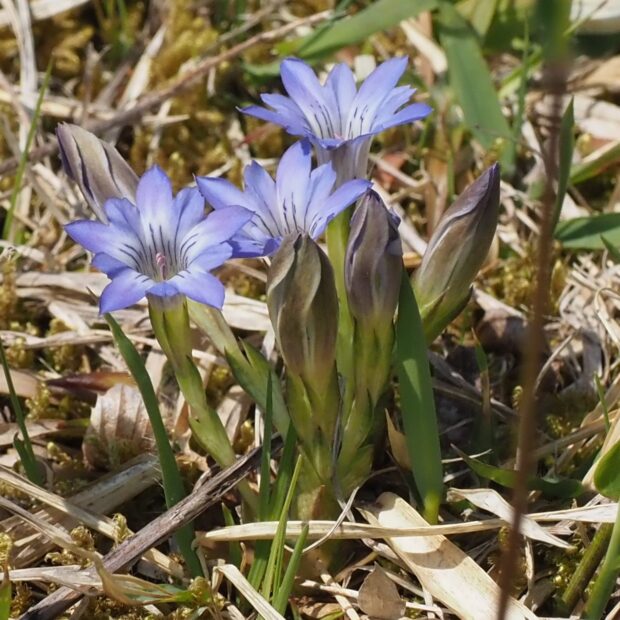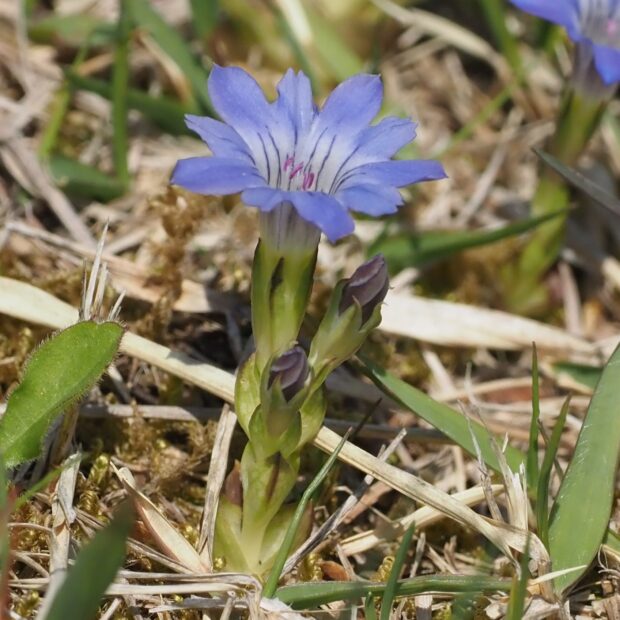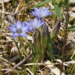 よく似たフデリンドウとは、 根生葉のあるなしが分類のポイントですが、 霜にあたって葉が枯れてしまうことも多く、 わかりにくいです。 湿った場所に生育することや、 複数の花茎が株の元から立ち上がること、 花茎につく葉の形などが見分けのポイントです。