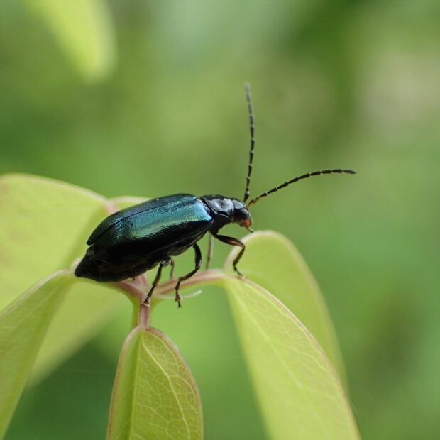 藍色の光沢があるヒゲナガハムシの仲間。 春から初夏に見られ、 胸にはっきりした横ひとすじの溝があるのが特徴です。 クワ、 ヒメコウゾなどの他、 いろいろな植物の葉を食べます。 メスは土の中に卵を産み、 幼虫は根を食べると言われています。
