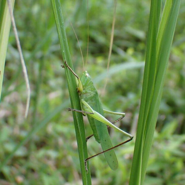 山には、 はねの先がとがるヒメクサキリがいます。