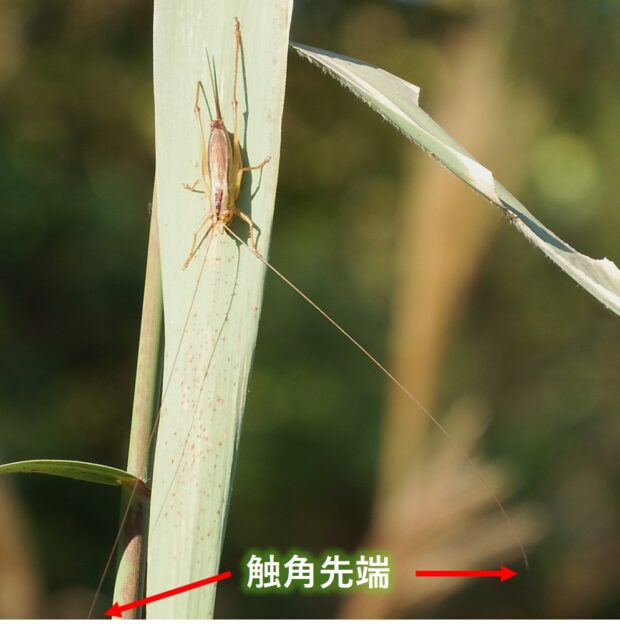 はねの短いキリギリスの仲間ですが、 稀にはねの長いタイプもいます。 触角がとても長く、 体の3~4倍もあります。 ヨシ原、 田んぼの周り、 湿気の多い草はらなどで見られます。 鳴き声は「ジ、 ジジ、 ジジジジ」。