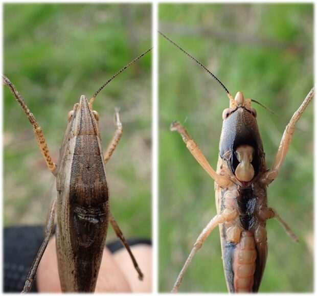 似ているクビキリギスは、 口の周りが赤いですが、 シブイロカヤキリは黒いです。