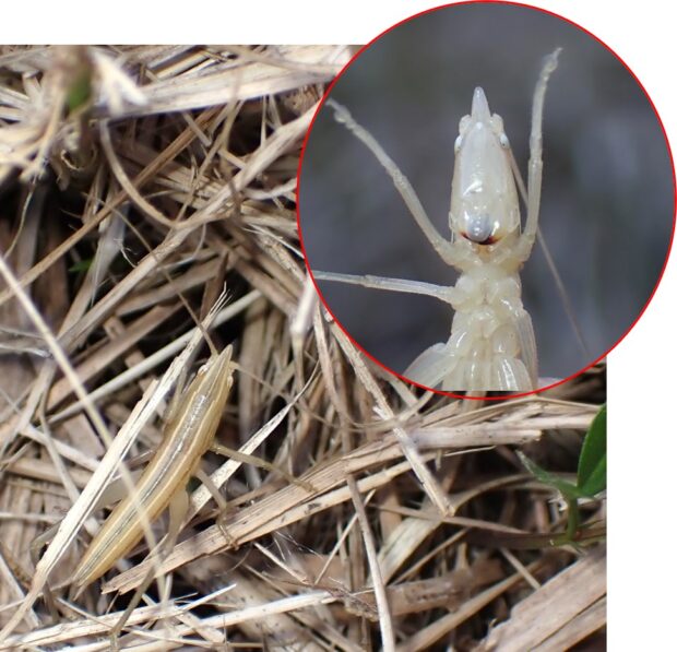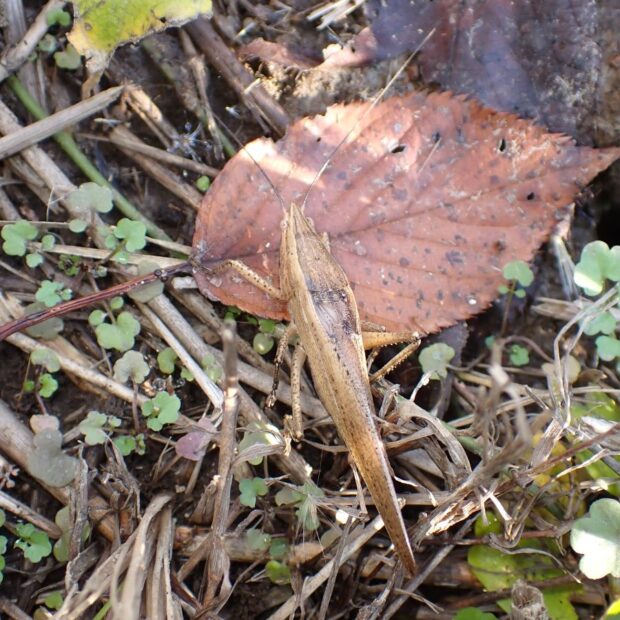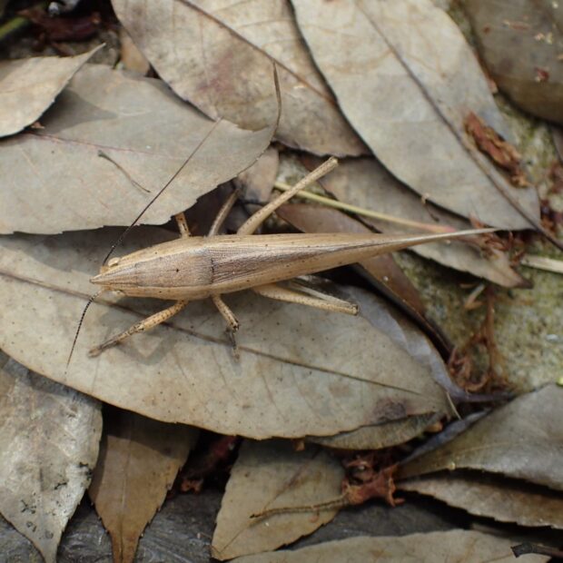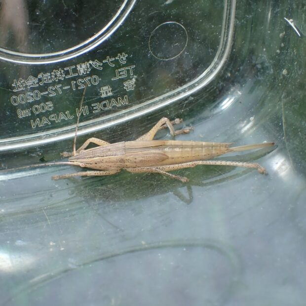 枯れ葉色で、 頭の先が尖っているキリギリスの仲間。 ススキ、 ヨシなど背の高いイネ科植物が多い草はらで見られます。 秋に成虫になり、 そのまま冬を越し、 翌年の春から初夏の夜に、 「ジャー」としわがれた大きな声で鳴きます。 メスは、 イネ科植物の根元近くの葉鞘に産卵します。