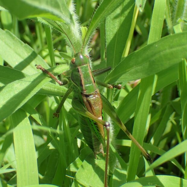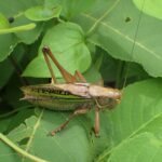 草はらで、 昼間に「ギーース、 チョン」と声は聞こえても、 姿はなかなか見られません。 キリギリスは、 東日本のヒガシキリギリス(はねは短めで前ばねに黒点が多い)と西日本のニシキリギリス(はねは長めで前ばねの黒点がないか、 あっても一列程度)に分けらます。 (MT)