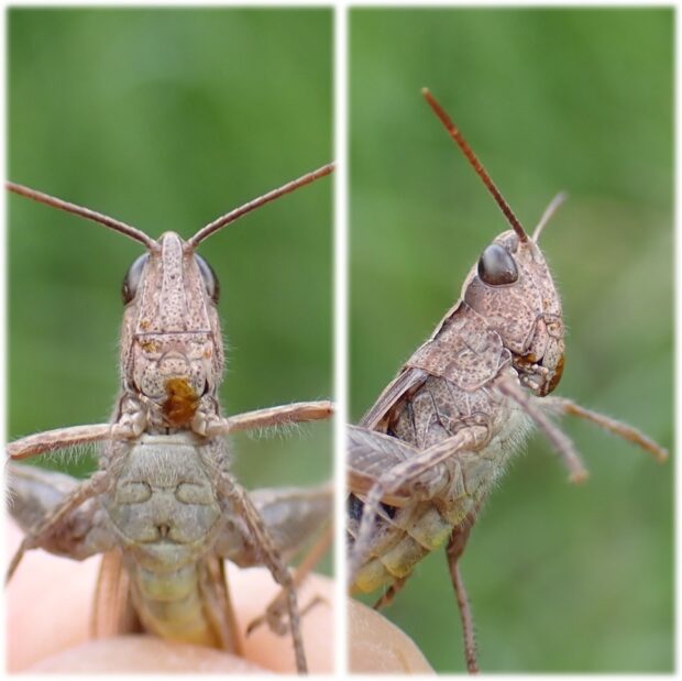 1年に2回発生し、 本州において、 卵で越冬するバッタの中では、 もっとも早く成虫があらわれます。 オスは前ばねに後あしをこすりつけ、 「シュリリリリリ・・・」と小さな音を出します。 (MT)