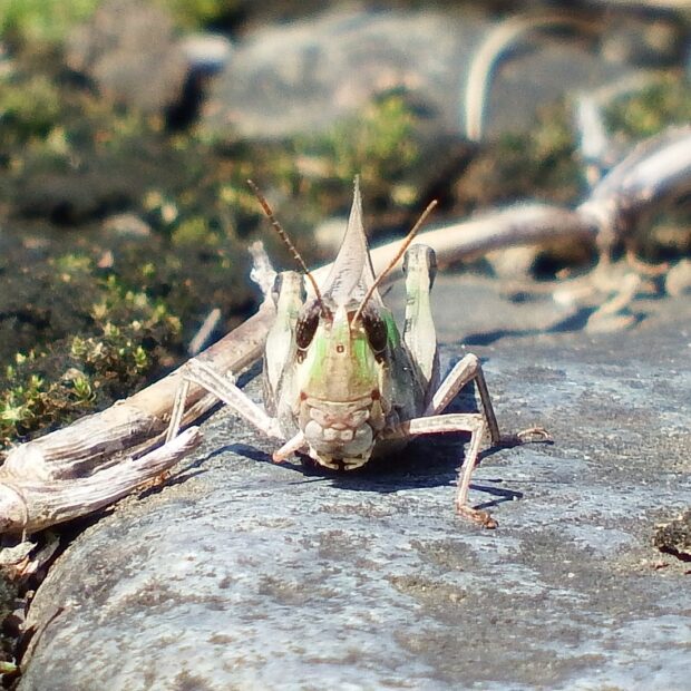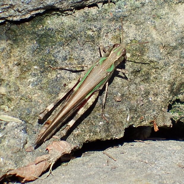 日当たりのいい半裸地を好む南方系のバッタ。 後あしに赤色、 黒色、 青色、 白色などのまだら模様があるのが特徴で、 名前の由来になっています。 体の色は褐色地、 緑色地、 まれに紅色がいます。 (MT)