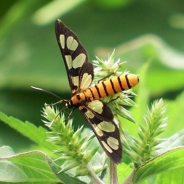 昼間に活動し、 花によくやって来るヒトリガの仲間。 ほっそりした黒いはねには、 鹿の子状(小鹿の背中にあるような模様)の半透明の白い紋があり、 黒いしま模様がある黄色の腹部が目立ちます。 (MT)