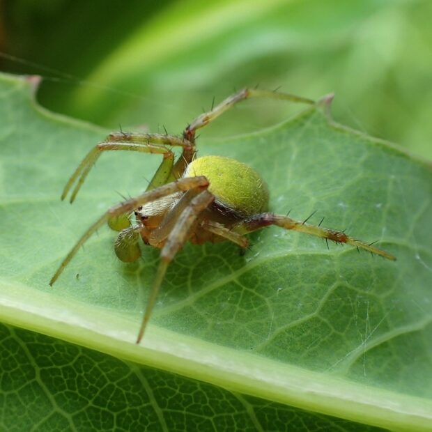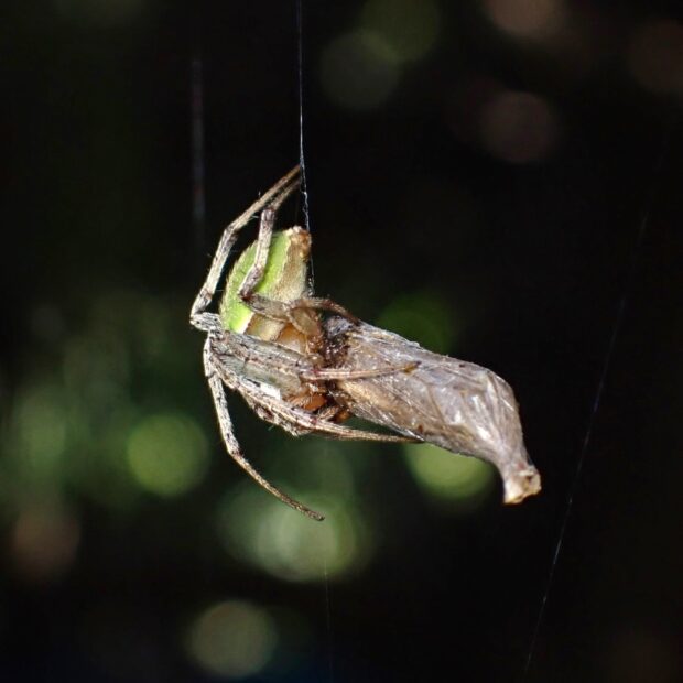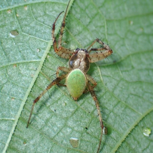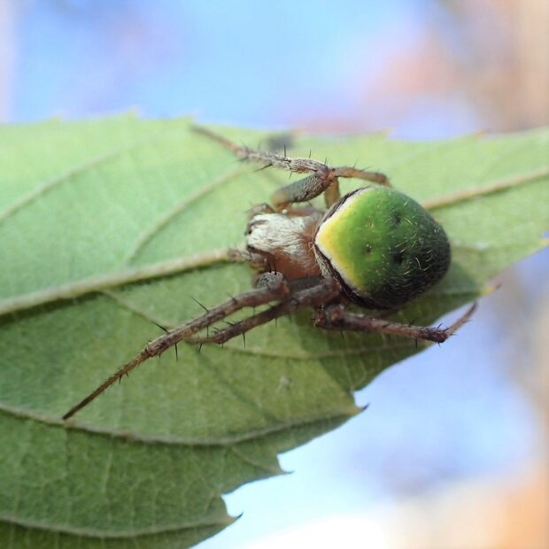 コガネグモの仲間。 お腹が緑色で、 横にある黄色い線より下面が黒褐色または茶色のクモ。 サツマノミ(ハゼの実のこと)に似ていることが名前の由来です。 昼間は葉の上で休んでいることが多く、 夕方から円網を張ります。 市街地の公園や庭で、 普通に見られます。