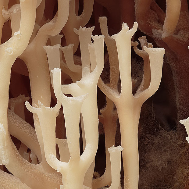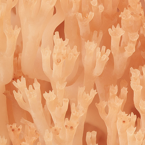 枯れ木に生えるホウキタケ型をしたきのこです。