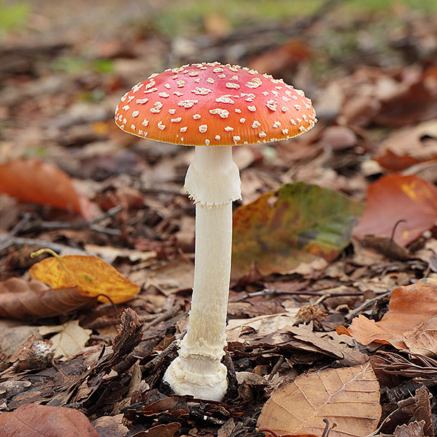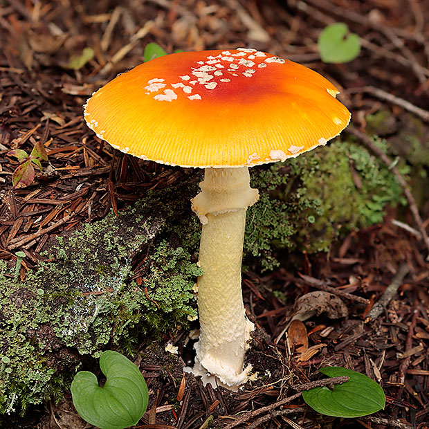 食用きのこのタマゴタケとにている毒きのこです。 傘の白いいぼは雨でとれやすいので、 いぼの有無だけで判断しないでください。 ひだや柄の色、 つぼの形で判断してください。