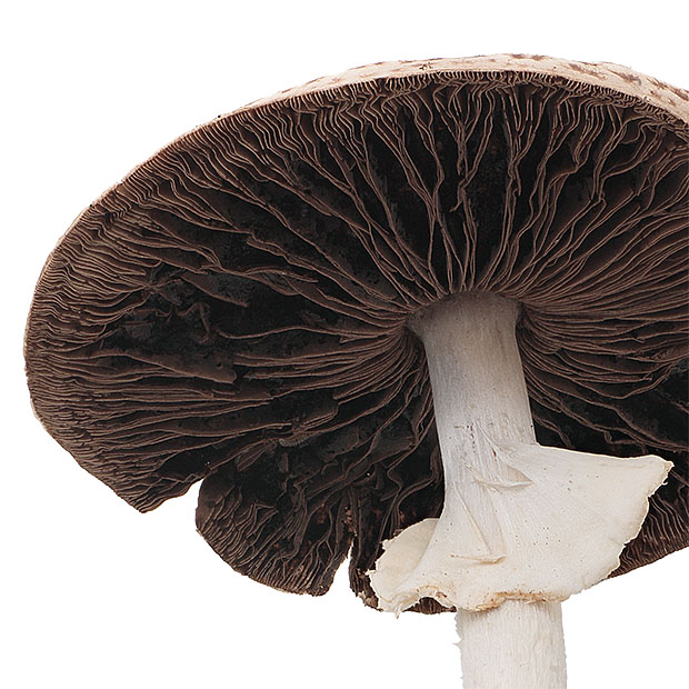 マッシュルームの仲間の胞子は黒っぽいです。 お店で売っているマッシュルームも胞子が成熟してくるとひだが黒っぽくなります。