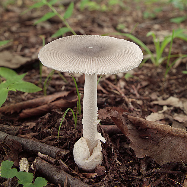 灰色のかさに筋(放射状の溝線)が目立ちます。