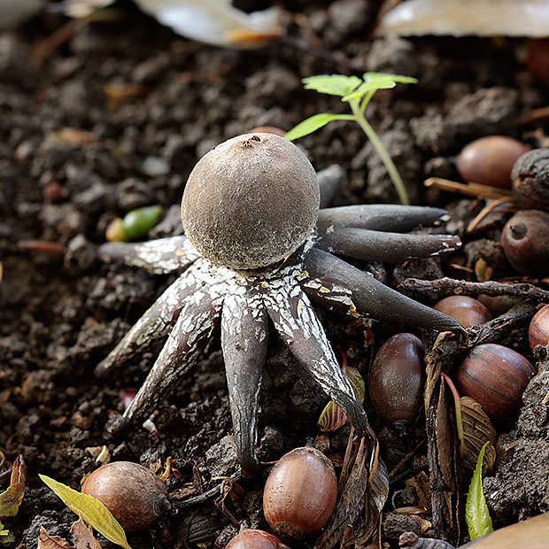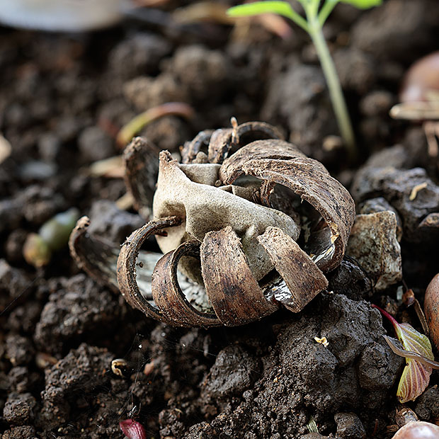 星形をしたきのこです。 晴れの日になるとまるまってしまい、 雨が降ると星形にひらきます。 発生すると腐りにくいので、 冬を越して春になってもみつかります。