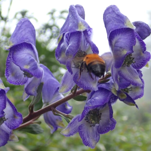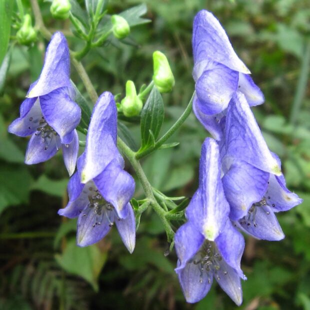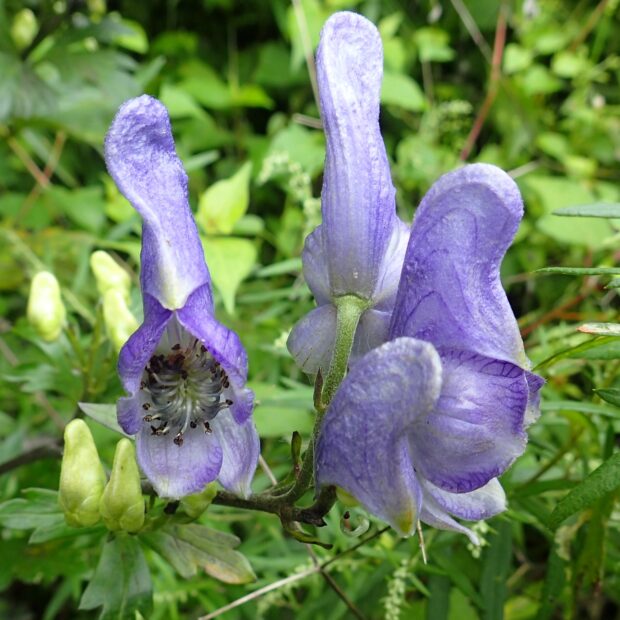 ドクウツギ、 ドクゼリと並んで日本三大有毒植物の一つとされるトリカブトの仲間は日本には約30種が自生しています。 トリカブトの名の由来は、 花が古来の衣装で頭にかぶる鳥兜・烏帽子に似ているから、 または、 鶏の鶏冠(とさか)に似ているからとも言われています。 ツクバトリカブトは筑波山で発見され命名されました。 (HT)