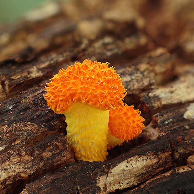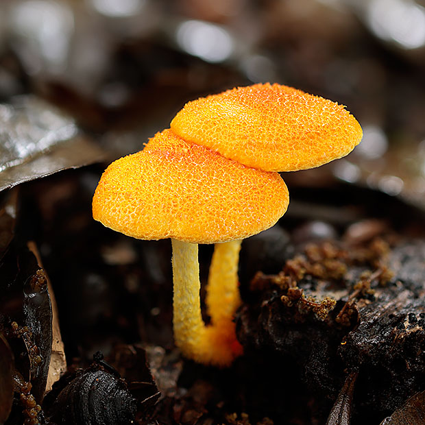 傘はオレンジ色の綿くずをとげとげにつける美しいきのこです。 日本では関東から西に分布し、 世界では熱帯を中心に広く分布します。