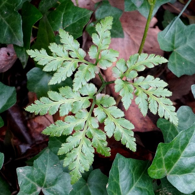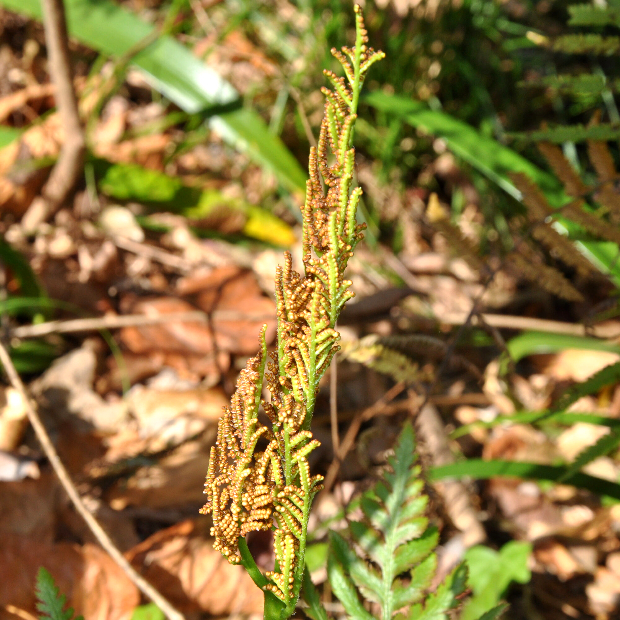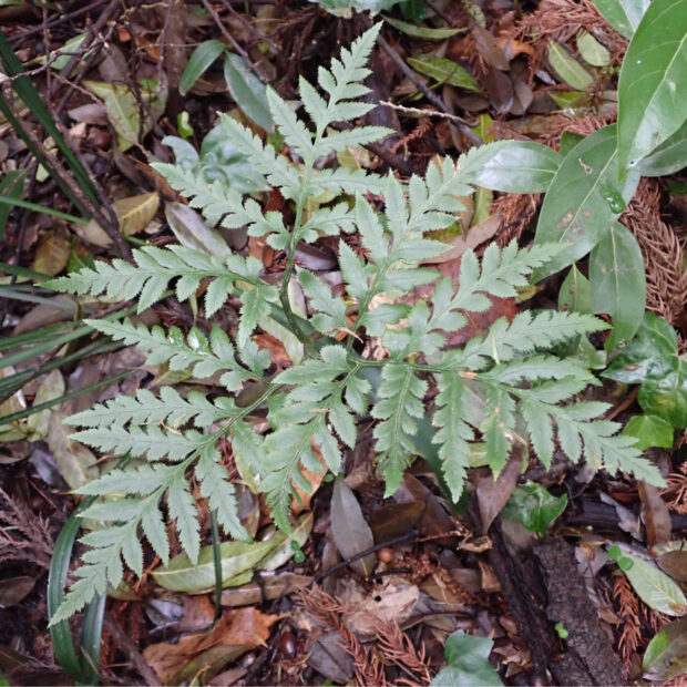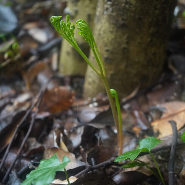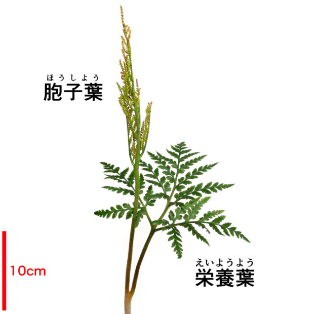 この仲間は花のように見える胞子を飛ばす胞子葉(ほうしよう)と、 光合成のみする栄養葉(えいようよう)が共通の柄から分かれている姿が独特です。 似たハナヤスリの仲間は葉が切れ込みません。