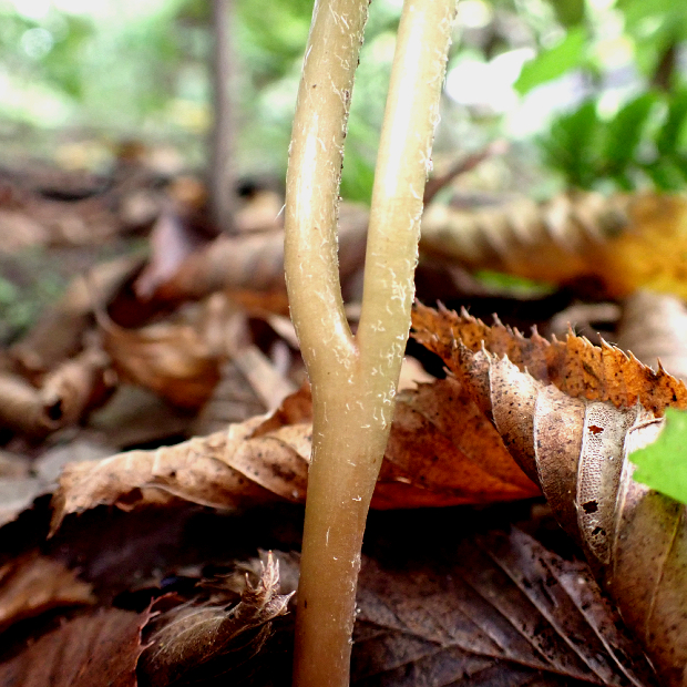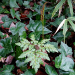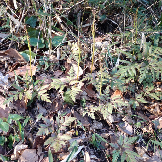 最も普通に見られるハナワラビの仲間のシダ。 花が咲いているような姿が特徴で、 冬が近づいてくると葉を出します。 似たフユノハナワラビなどとは、 栄養葉が平面的で、 フチのギザギザ(鋸歯)が鋭いことなどで見分けられます。