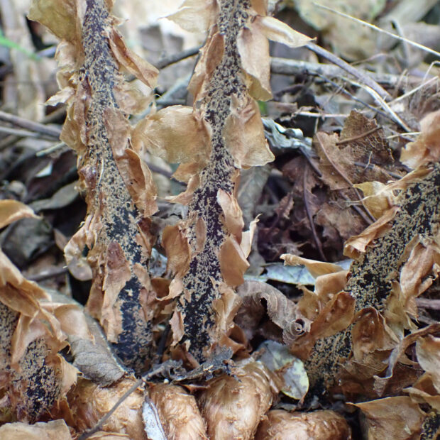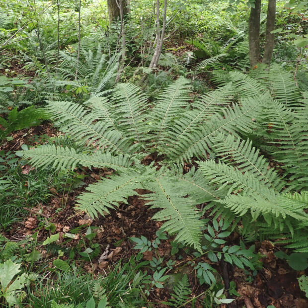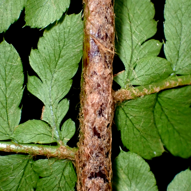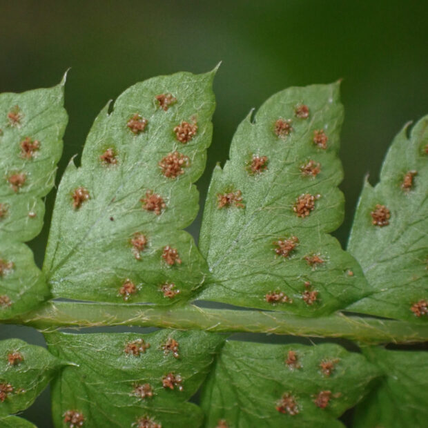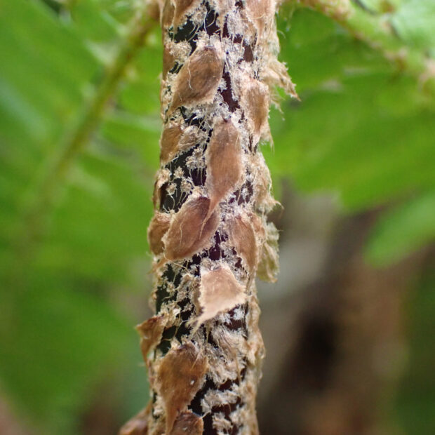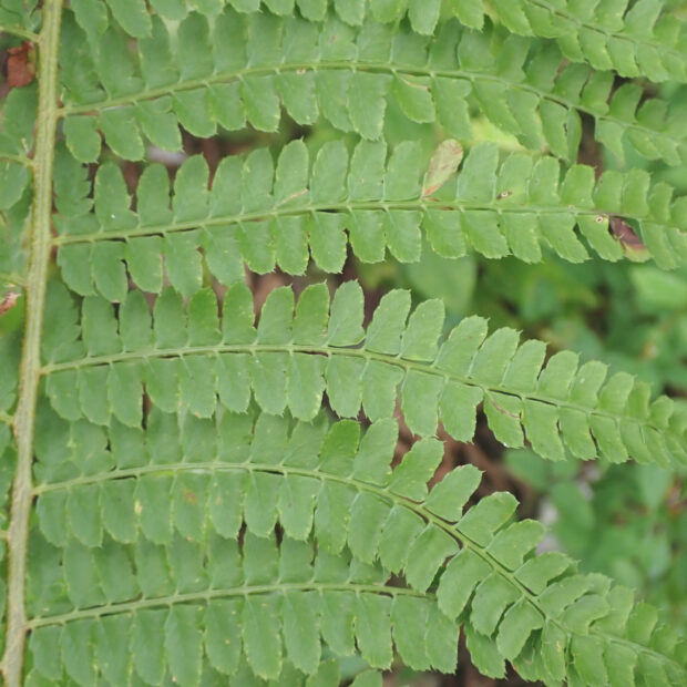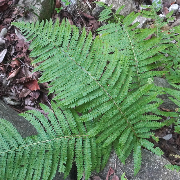 涼しい環境の林内でよく見られるイノデの仲間のシダです。 葉軸の下向きに圧着する鱗片が大きな特徴です。