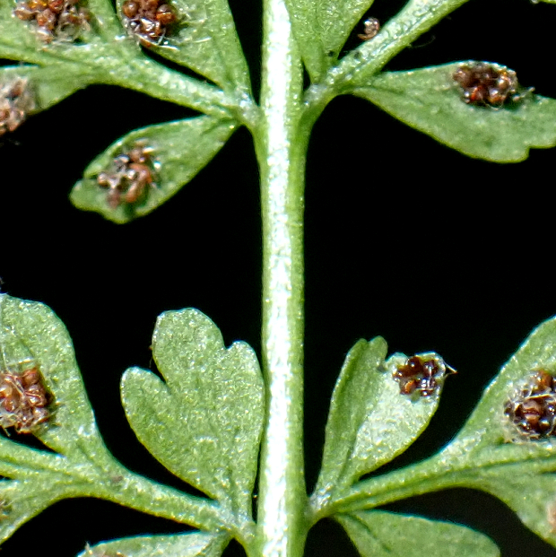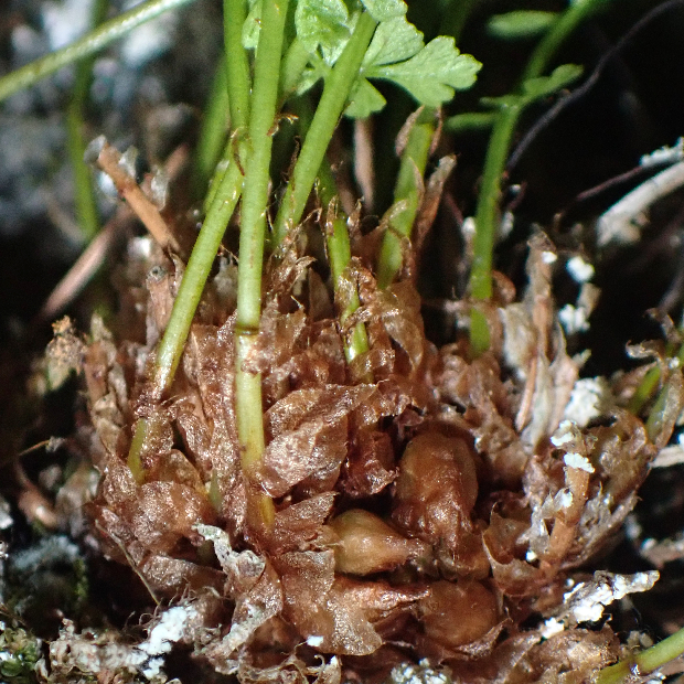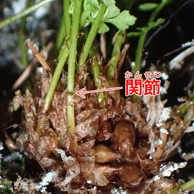 ちなみにトガクシデンダの学名はWoodsia glabellaですが、 これと別種とする場合のケンザンデンダの学名として、 日本では1914年にWoodsia tsurugisanensisが最初にあてられました。 後にそれより前の1891年に中国で命名されたWoodsia hancockiiと同種とされ、 命名の優先権からこちらの学名が使われてきました。