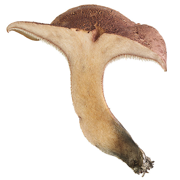 傘の裏が針状で、 食用きのこのコウタケと似ていてます。 ケロウジの傘の中央部はへこまず、 傘の表面の鱗片はほとんど立ち上がりません。 柄の根もとは青色をおびます。 味はとても苦いです。