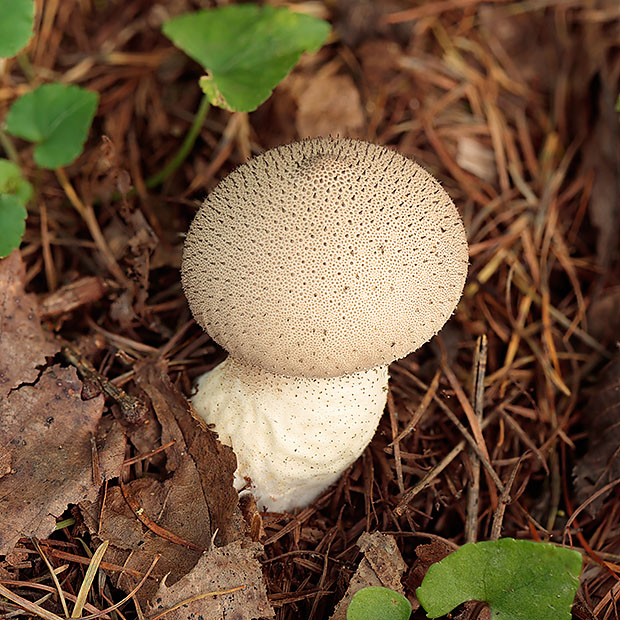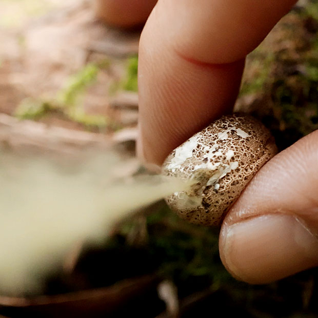 球形の頭に柄がついて、 森でであうとまるで、 もののけ姫に登場するこだまみたいです。 成熟したホコリタケをつまむと、 ほこりのように胞子がでてきます。