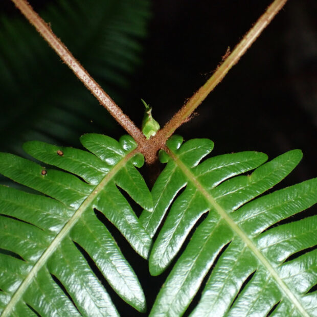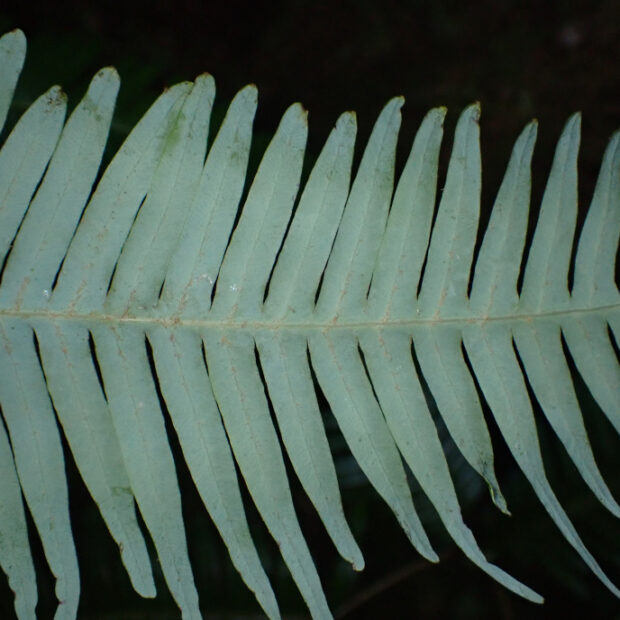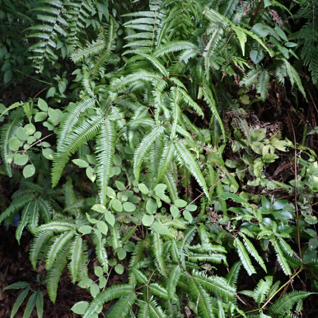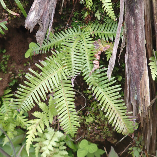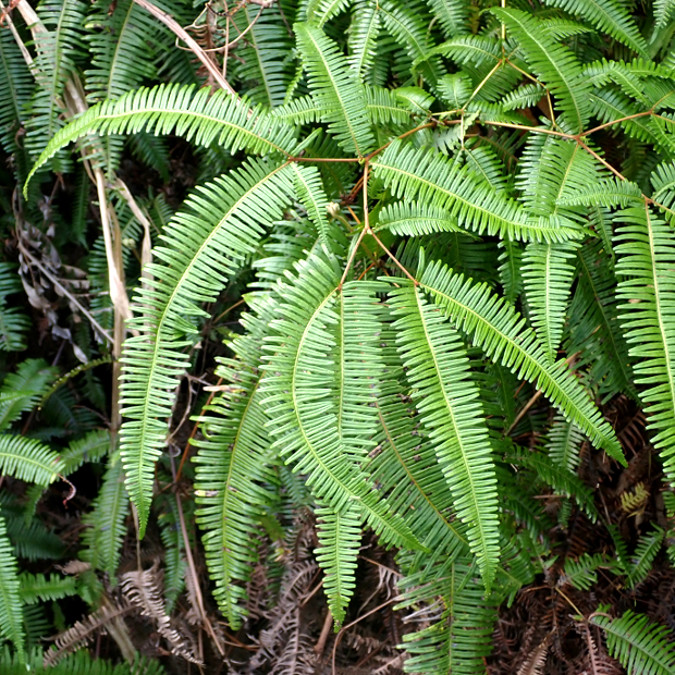 暖かい地域にごくふつうに見られるシダです。 正月飾りにも使われるウラジロのの別名がオオシダで、 それより小さいことからコシダといいます。 とはいえ、 本土でみられるシダの中では大きめで、 斜面に一面に生えることもあります。