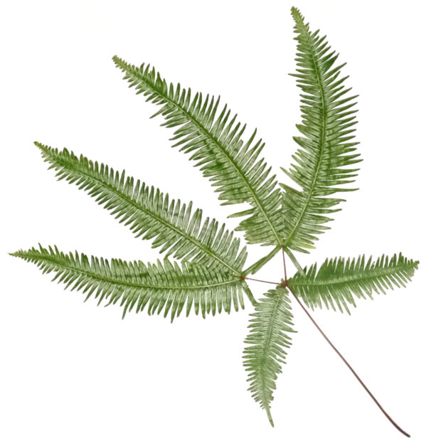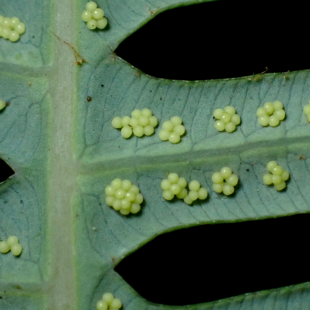 ●ウラジロは①コシダより大きくなり、 ②小羽片は深く切れ込み、 ③1本の軸からのみ羽片を出し、 ④胞子のう群は1つにつき胞子のう1~4個と少ないことなどが特徴です。