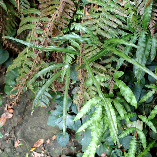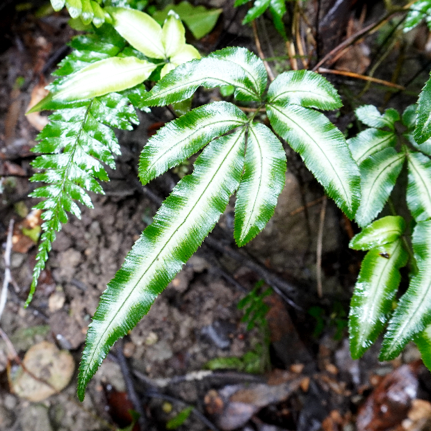 暖かいところに多いシダ。 葉は革のように厚く、 中央によくきれいな白斑がつきます。 「マツザカシダ」ともいいますが、 三重県の松坂(まつさか)市が由来なので、 「マツサカシダ」が本当の意味では正しいです。