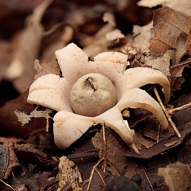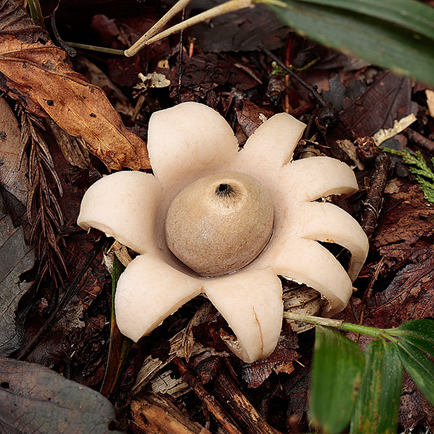 ツチグリのように星形をしたきのこです。 ツチグリと形は似てますが、 別のグループです。 ヒメツチグリ属のなかまは、 ツチグリのように雨がふるたびに皮が開いたり閉じたりしません。 いちど開いたら閉じません。