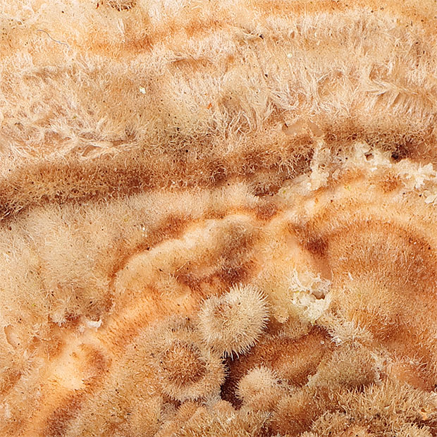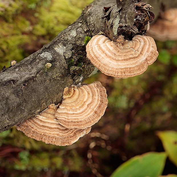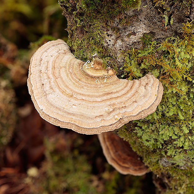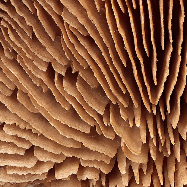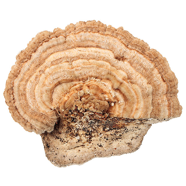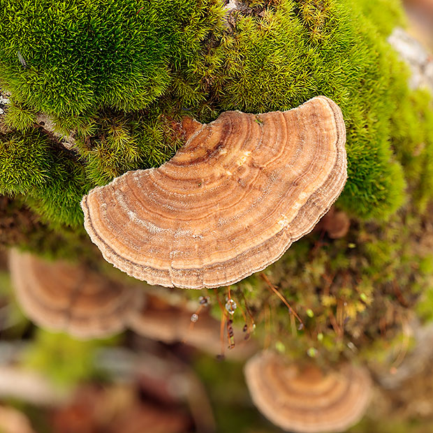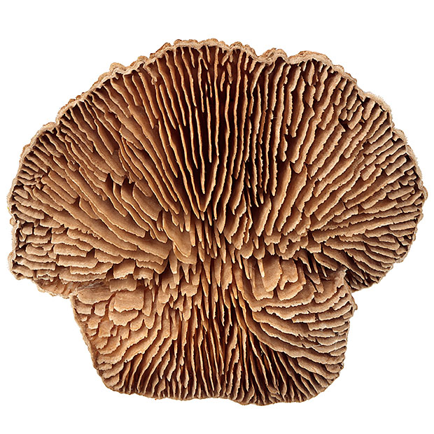 傘の表面は2枚貝のように環状の筋のある皮のようにかたいきのこです。 でも、 傘の表面に環状の筋のあるかたいきのこの種類はけっこうあります。 傘の表面に毛があって、 傘の裏面がヒダ状になることが見分けるポイントです。