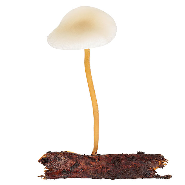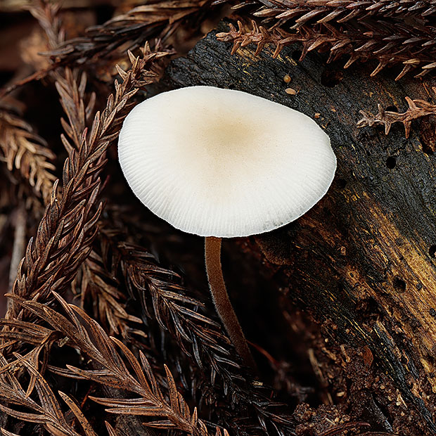 秋が深まってくるとスギの近くでよく生えます。 スギの落ち葉のあいだで、 白い傘はよく目立ちます。 柄の根もとは落ち葉に埋もれたスギの落ち枝につながってます。