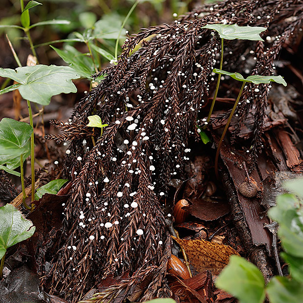 晩秋にスギの落ち葉にたくさん生えるきのこです。 ケナワタケと似ています。 スギノオチバタケは傘の表面や柄の表面が粉状です。 生える時期や生える場所もちがいます。