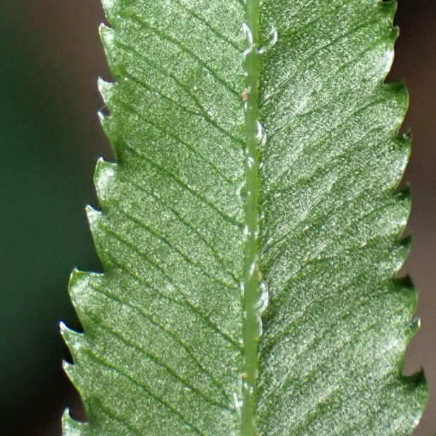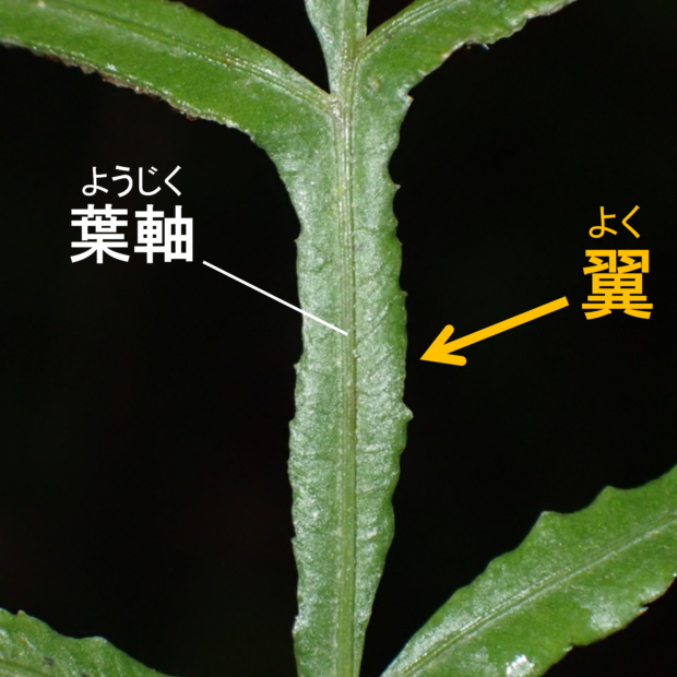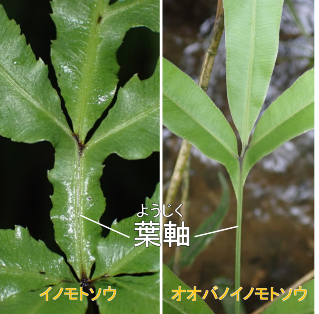 ●オオバノイノモトソウは①大きくなり、 ②葉軸に翼がなく、 ③脈はフチに達します。