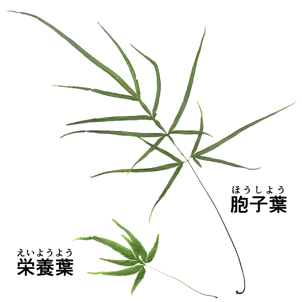 ●マツサカシダは①暖地に多く、 ②葉が革のように厚く、 ③葉軸に翼がありません。