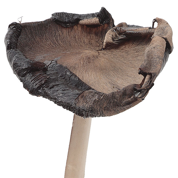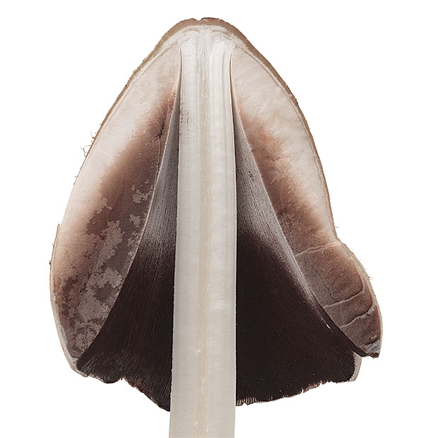 傘を開くとひだを液化させ、 一晩で傘が消えてしまいます。 黒いインクのように胞子を含んだ液をたらします。 黒い胞子はまるでサングラスのように有害な紫外線を防ぎます。 そして胞子の寿命をのばすことができます。