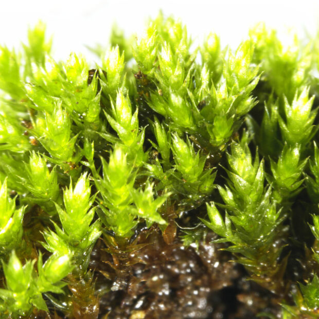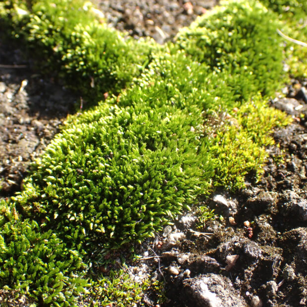 都会のアスファルトのすき間などでよくマット状に生えている身近なコケです。 冬でもあざやかな緑色なので目立ちます。 意識して探すとその多さに気付くかも?