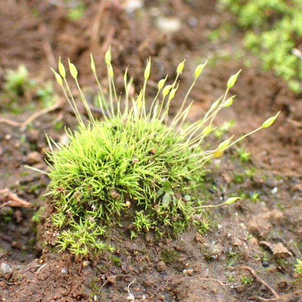 道ばたの土上に生える小さなかわいらしいコケ。 丸い形に生えることが多く、 しばしば蒴(さく)をたくさんつけます。