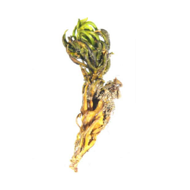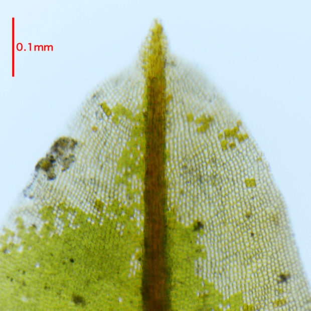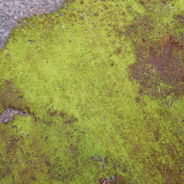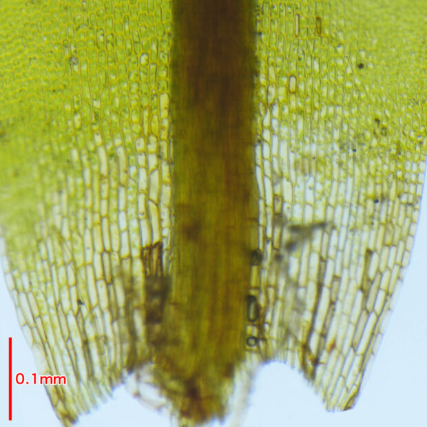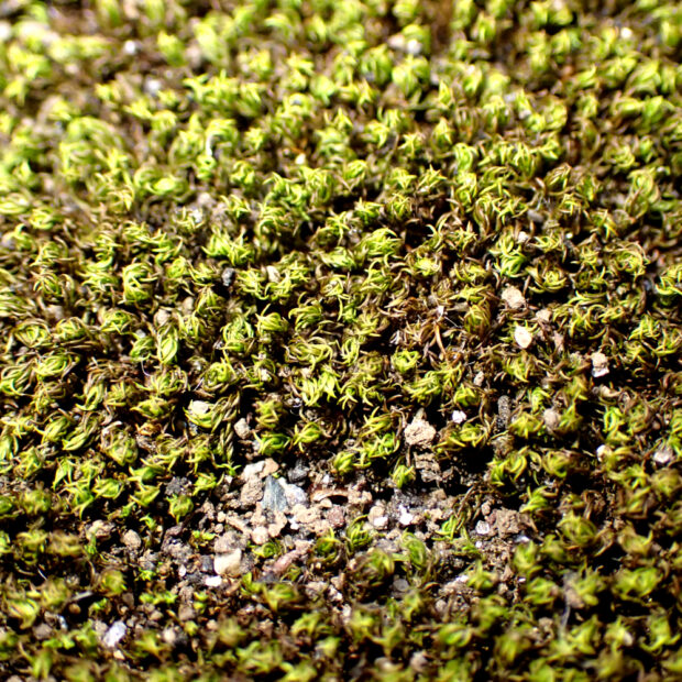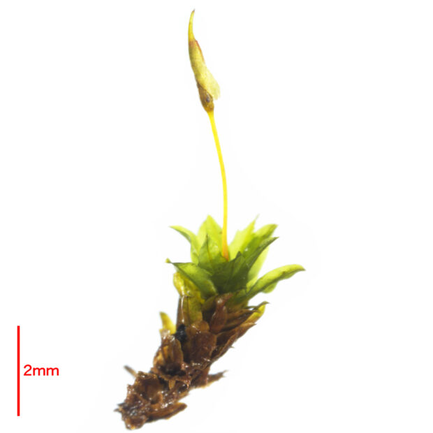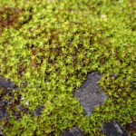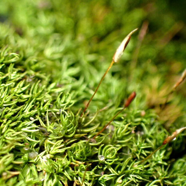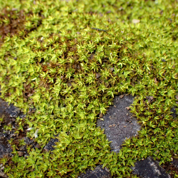 市街地の石垣や道路のすき間などにもたくさん生える最も身近なコケの1つ。 乾くと葉のフチを巻くことからこの名があります。 石垣に黄緑色か茶色っぽいコケが一面についていたら、 このコケかも?