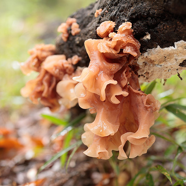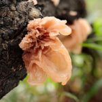 花びらがいくつも重なったような姿をしたきのこです。 肉はゼリー状で、 触ってみるとぷるぷるします。 ハナビラニカワタケのなかまは、 ウロコタケ属 Stereum の菌糸に寄生していることが知られています。