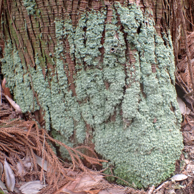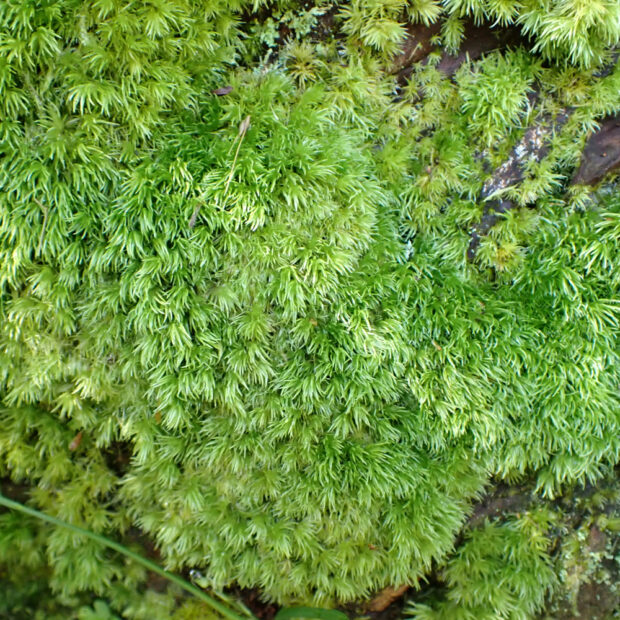 林内の土上やスギの根元近くによく生えている翁(おきな : おじいさんのこと)の白髪ようなコケ。 園芸の世界では似た種と合わせて「山苔(ヤマゴケ)」といわれ、 よく盆栽などに用いられています。