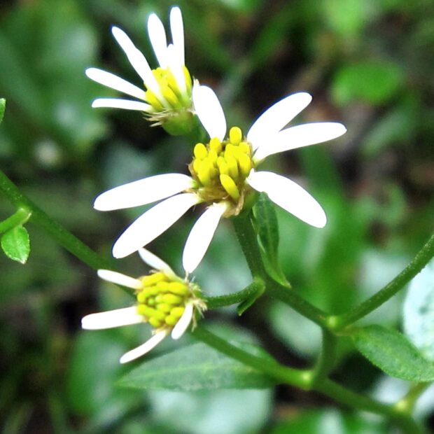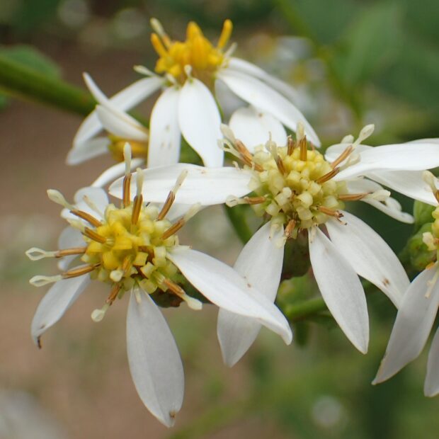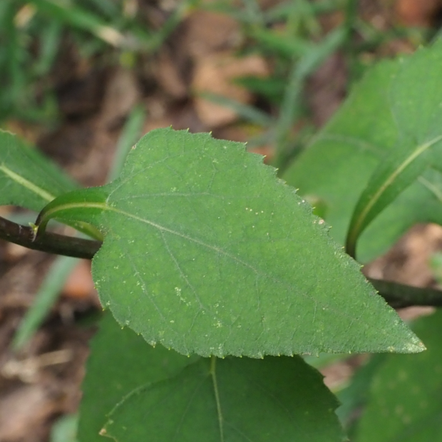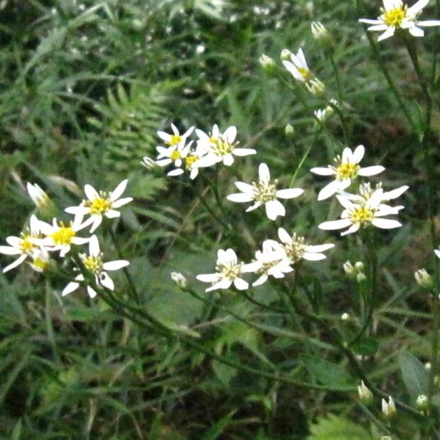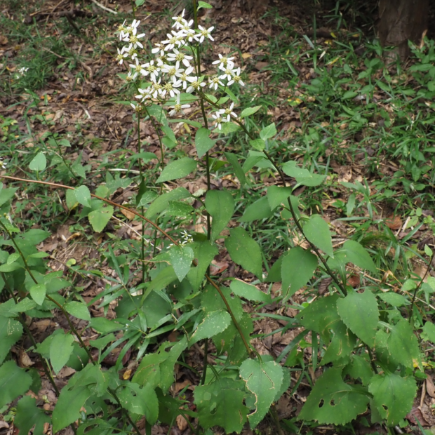 秋に山で咲く白い野菊で、 背が高くなります。 よく似たシロヨメナより白い花びら(舌状花)が少なめで控えめな感じがします。 葉が大きくてざらざらしているのが特徴です。