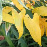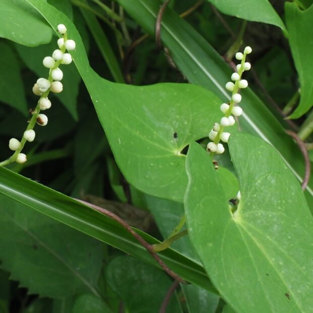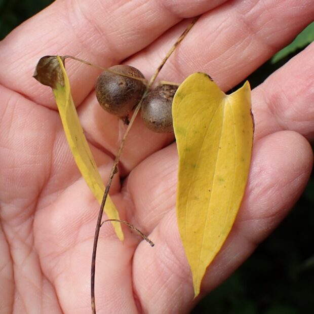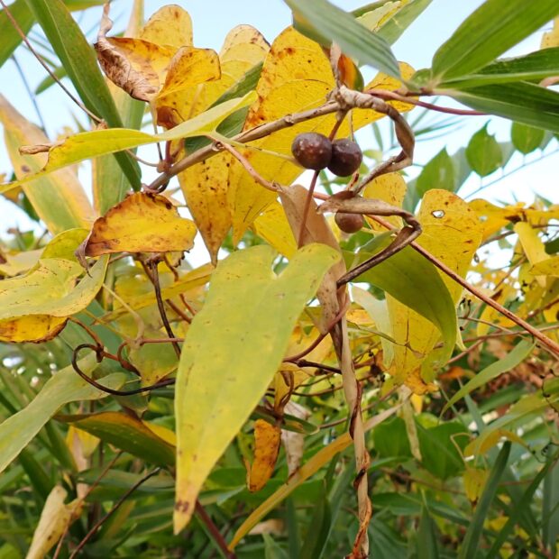 秋にハート形の黄色い葉が目立って存在感のあるつる植物です。 根は自然薯(じねんじょ)と呼ばれ、 すりおろすと粘りのある「とろろ」になります。 「むかご」と呼ばれる球芽も食べておいしいです。