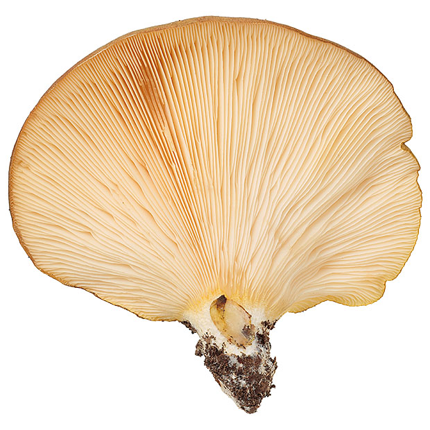 傘の表面の皮がむけやすいきのこです。 傘の横に短い柄がつき、 ヒラタケに似ています。 ムキタケの傘の表面は毛がありますが、 ヒラタケの傘の表面は毛がありません。