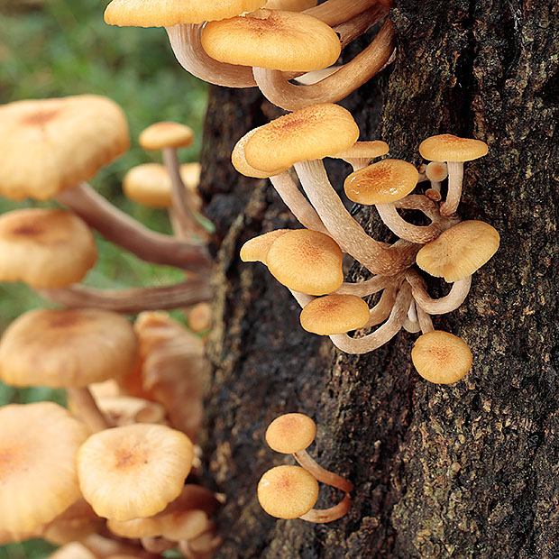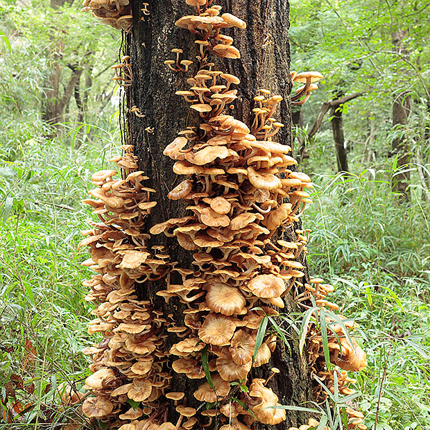 夏から初秋の暑い時期によくみかけるきのこです。 公園では弱った桜などの周辺によく生えます。 ナラタケに似ますが、 柄の途中に付着物がありません。